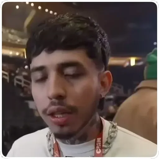 A young man with black hair and a white t-shirt, looking bored or surprised, with a unique facial expression and a red lanyard around his neck.