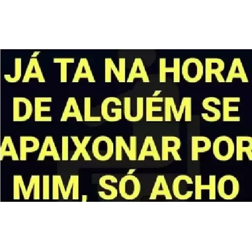 A black rectangle with yellow text: 'JÁ TA NA HORA DE ALGUÉM SE APAIXONAR POR MIM, SÓ ACH'