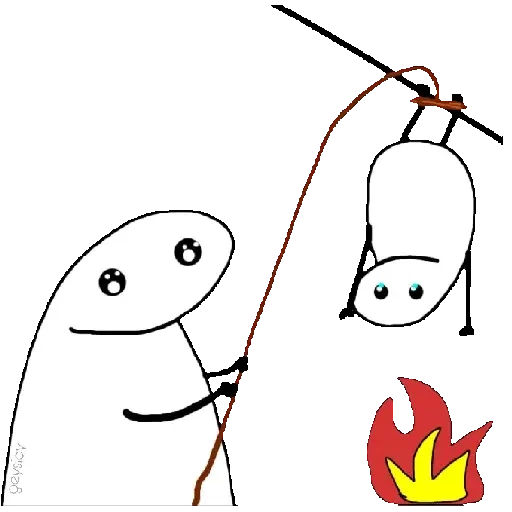 Two cartoon characters, one pulling a rope with the other hanging in the air, above a flame. The character pulling the rope has a smile on his face.