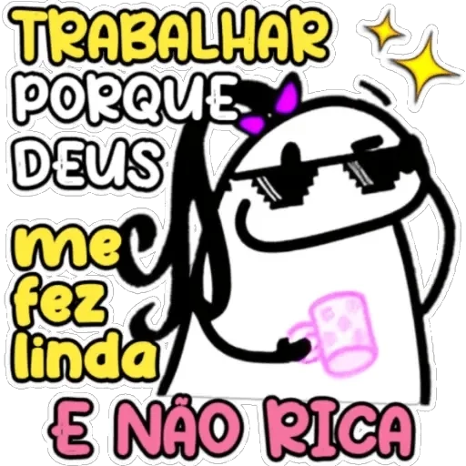 Um desenho de um personagem com uma faixa rosa no cabelo e uma flor no peito, com o texto 'Pra você coisa linda!' e um…