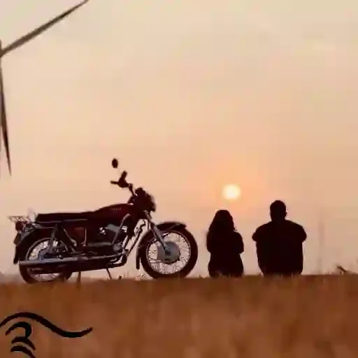 A couple watches the sunset next to a motorcycle in a field, with a wind turbine blade in the background.