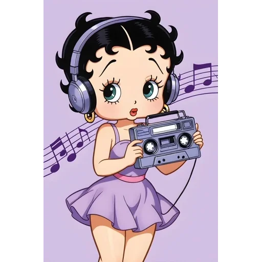 Betty Boop wearing headphones and holding a cassette, with musical notes in the background on a purple backdrop.