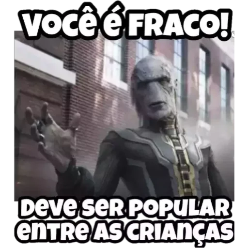 A character from a movie or series in a dramatic pose, with hands raised and serious expression, in front of a building. The caption reads 'Você é fraco! Deve ser popular entre as crianças'.