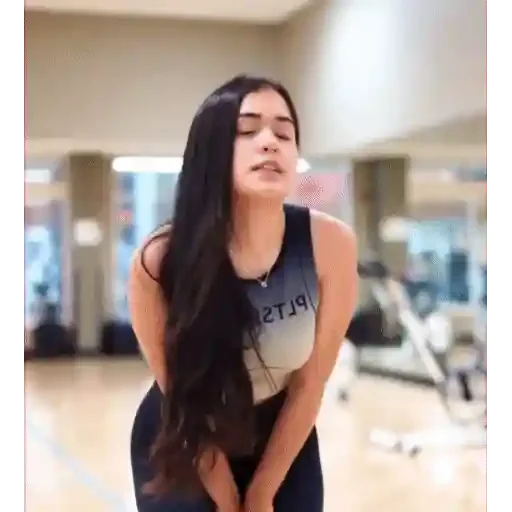 A young woman with long black hair and a gray and black top making a pained or effort face in a gym.