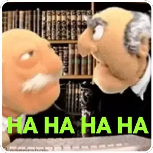 Two cartoon characters, resembling puppets, laugh and display 'HA HA HA HA' in green letters. They are dressed formally and have funny expressions.