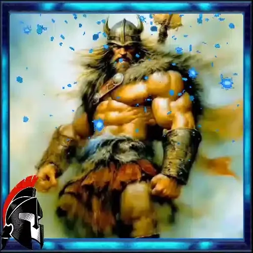A muscular warrior with a horned helmet and animal furs, set against a blue background with particle effects.