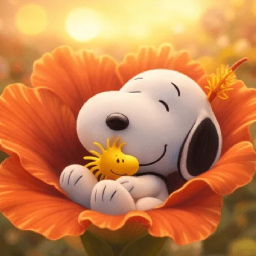 Snoopy and the Little Yellow Bird resting inside a giant orange flower at sunset.