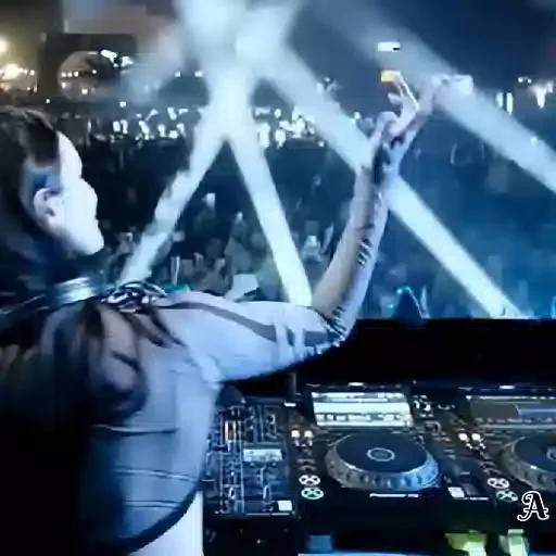 A dark-haired woman with a wristband on her right wrist is seen from behind, with her arms raised at a party. She is in front of a DJ booth with stage lights.