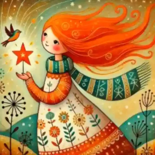 A girl with orange hair and a floral dress holds a star, with a bird beside her, in a scene of flowers and a starry sky.