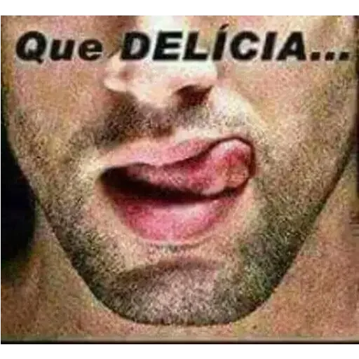 Man's face with open mouth and tongue out, text 'Que DELÍCIA...' in black.