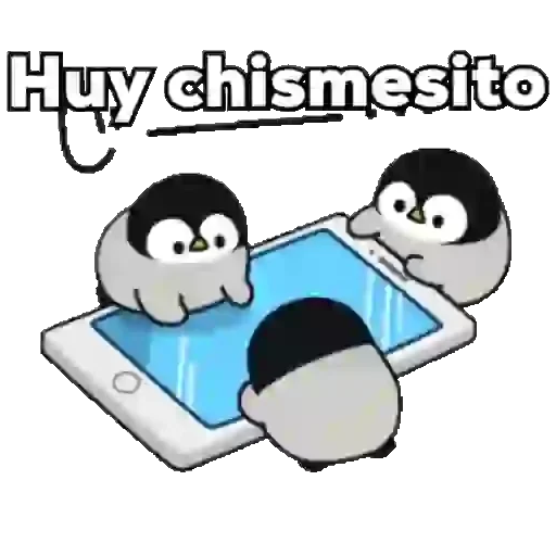 Three penguins on a cell phone, with the phrase 'Huy chismesito' written above. The penguins have curious expressions and are looking at the cell phone screen.