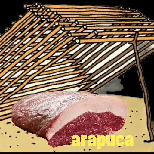 A raw meat cut with a knife next to it, under a barbecue grill. The word 'arapuca' appears in yellow at the bottom.