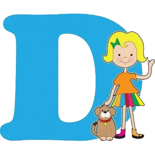 Blonde girl with a dog next to a large blue letter D.