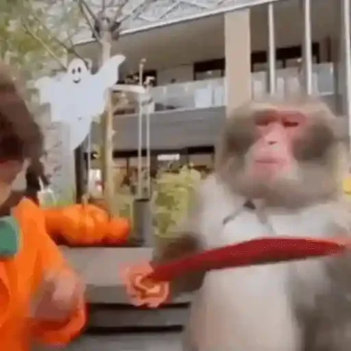 A monkey and a child dressed up for Halloween, with pumpkins and a ghost in the background.