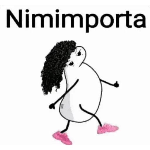 A simple drawing of an oval person with black hair and pink shoes, with an indifferent expression, and the word 'Nimimporta' written above.