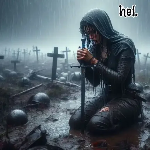 A hooded man kneeling in a cemetery, holding a sword, with the word 'hel' in the top right corner.