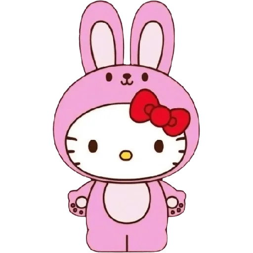 Rosto de Hello Kitty com um laço rosa, fazendo um gesto com a mão e com dois triângulos rosas atrás da cabeça.