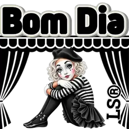A woman with grayish-blonde hair and colorful makeup, wearing a black hat, black and white striped shirt, black skirt and shoes, sitting with her arms crossed. The image features the text 'Bom Dia' in large letters.