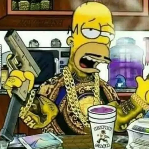A yellow-skinned man with a surprised or pained expression, holding a gun and wearing gold chains. He is in a setting with a window in the background and a cup with purple liquid in front.