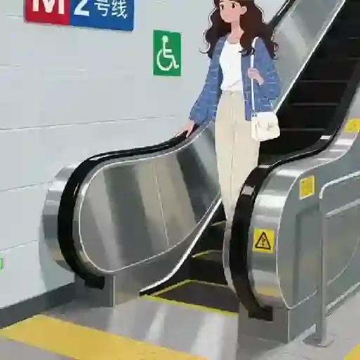 A woman with brown hair is on an escalator, wearing a blue jacket, white shirt, and beige pants. There are accessibility and signage plates in the background.
