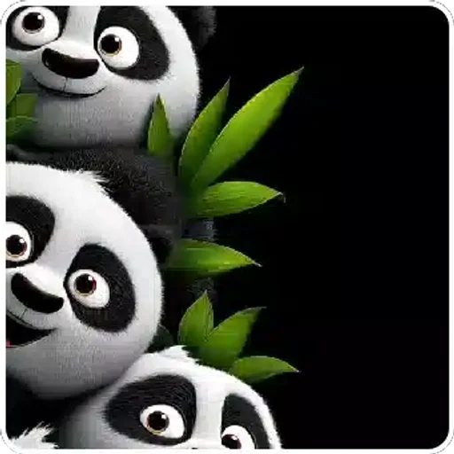 Three cute pandas with funny facial expressions, wide eyes, and green leaves in a black background.