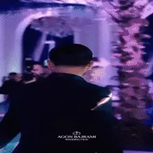 A man in black, seen from behind, in a purple-lit environment with a architectural structure in the background. A small logo is visible at the bottom.