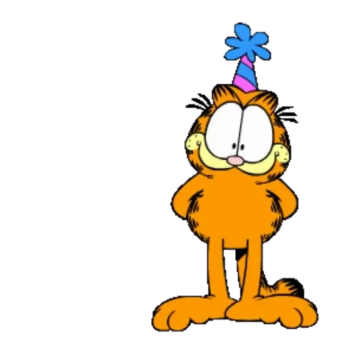 Orange cartoon cat with a happy expression, wearing a pink and blue party hat with a blue star on top.