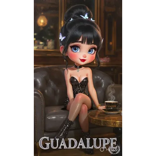 An anime girl sitting on a sofa, wearing a black bodys, with black hair and blue eyes, adorned with white butterflies. She is in a dark setting with a picture in the background and 'GUADALUPE' written below.