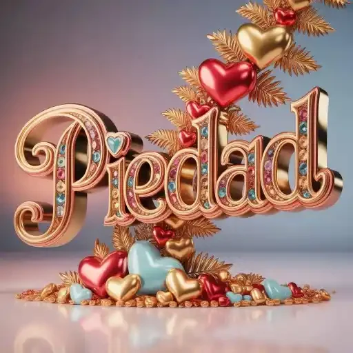 A 3D text that says 'Piedad' decorated with colorful hearts and golden leaves.