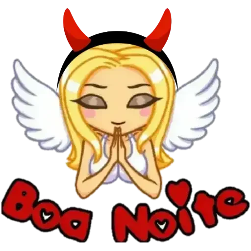 A blonde girl with angel wings and devil horns, hands clasped in prayer and eyes closed. She has a sweet and innocent expression. Below her, it reads 'Boa Noite' with hearts.