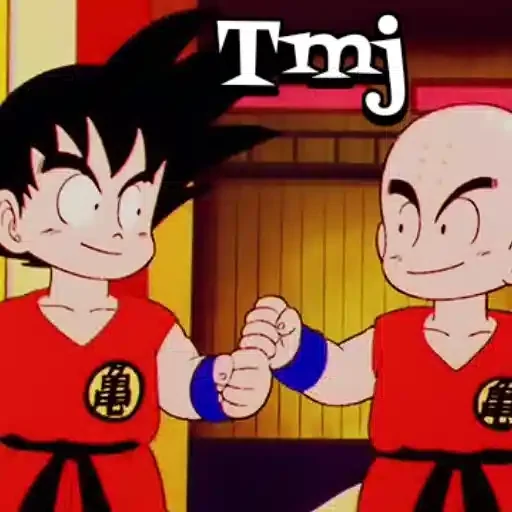 Dois personagens do Dragon Ball, um com cabelo preto espetado e o outro careca, fazendo um gesto de punho com uma…