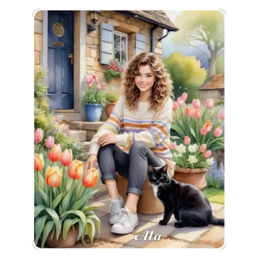 A woman sitting on a step with a black cat beside her, in front of a house with colorful flowers and tulips.