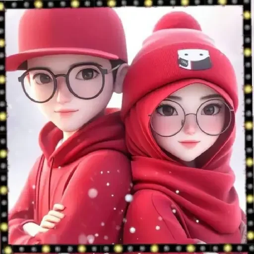 A pair of anime characters wearing red outfits, including a cap and a hat with a patch, both with glasses.