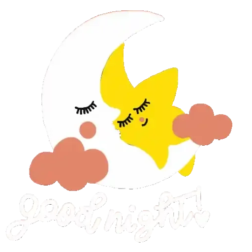 A smiling yellow star with eyelashes sleeping on a pink cloud next to a crescent moon, with 'goodnight' written below.