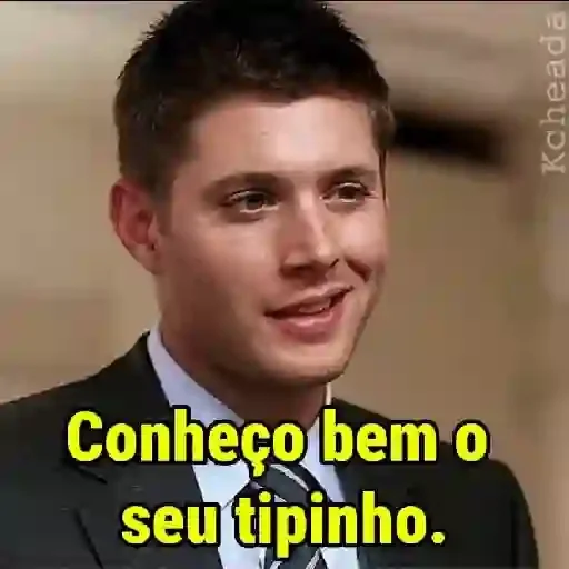 A man in a suit and tie with a subtle smile, with the text 'Conheço bem o seu tipinho.' overlaid in yellow.
