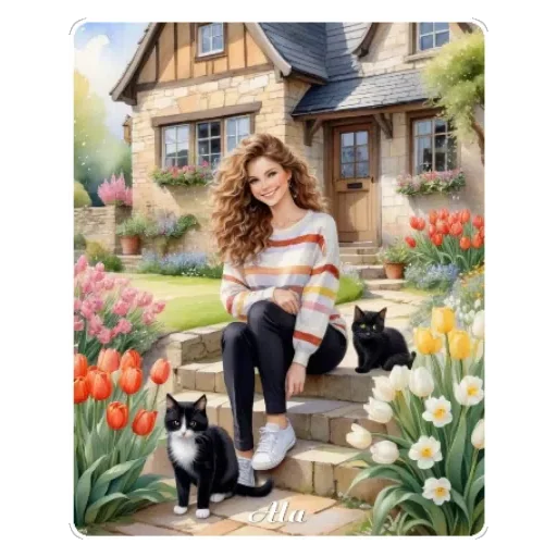 A woman with wavy brown hair sitting on steps of a wooden house, surrounded by colorful flowers and two black cats. She wears a striped sweater in shades of white, orange, and red.