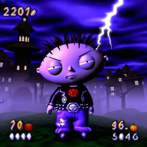 Cartoon baby character with purple and black clothes, in a nighttime scene with a lightning bolt. The character has closed eyes and a sleeping expression. Numbers and icons are visible at the top left and bottom.