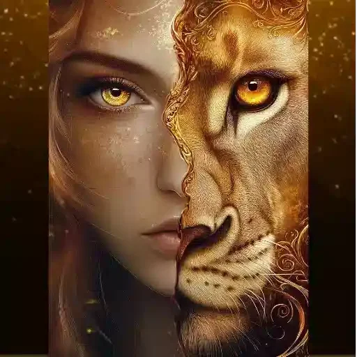 Face of a woman next to a lion's face, both with bright yellow eyes. The background is dark with stars and golden designs.