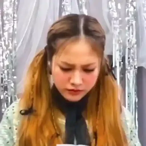 A girl with long, straight brown hair pulled back into two side ponytails, wearing a white sweater with black spots and a black scarf. She looks sad or disappointed.
