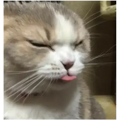 A gray cat with its tongue out and half-closed eyes, looking relaxed or playful.