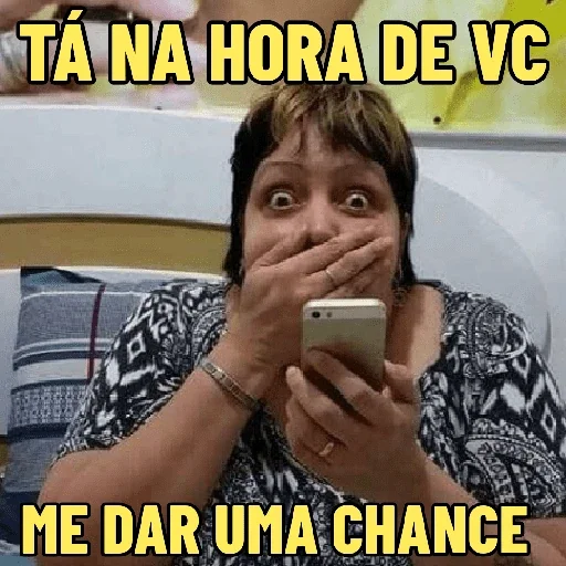 A woman with a surprised expression and hands over her mouth, holding a cell phone. The image has yellow text: 'TÁ NA HORA DE VC ME DAR UMA CHANCE'.