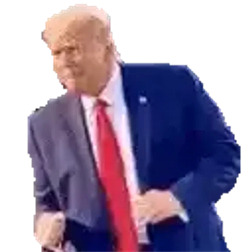 A middle-aged man with light hair, wearing a blue suit, red tie, and white shirt, with a serious facial expression and hands near his abdomen.