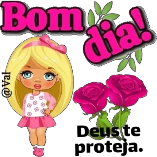 A blonde girl with a pink bow, wearing a pink skirt and white top with pink hearts, next to red roses and the phrase 'Bom dia! Deus te proteja.'