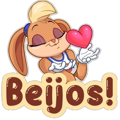 A cartoon rabbit character with a blue hair bow and white and blue top. She has her eyes closed and a red heart in her hand, with the text 'Beijos!' in brown letters.