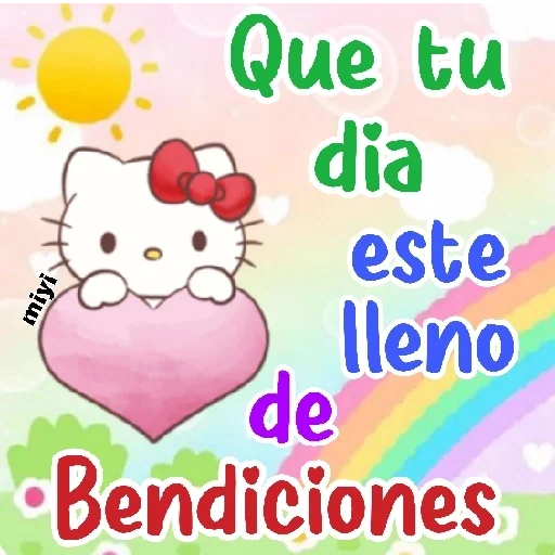 Hello Kitty com um laço vermelho no cabelo, sorrindo, em um fundo colorido com arco-íris e sol. O texto 'Buenos dias'…