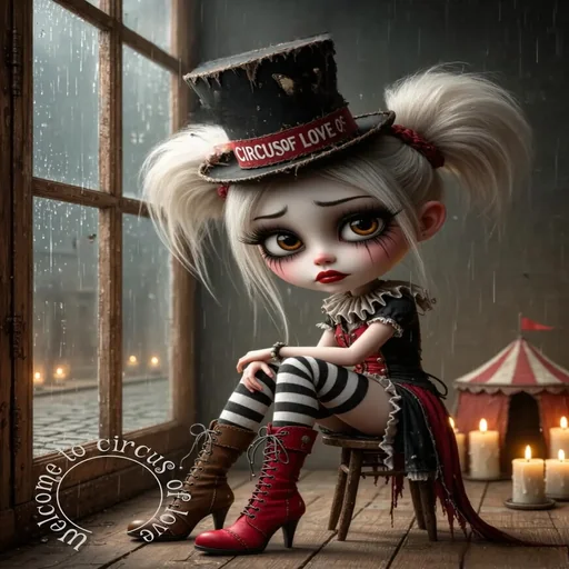 A girl with white hair in pigtails, clown makeup, a black hat, and black and white stripes, sitting on a chair next to lit candles and a circus tent in the background, in a room with a window overlooking a rainy night.