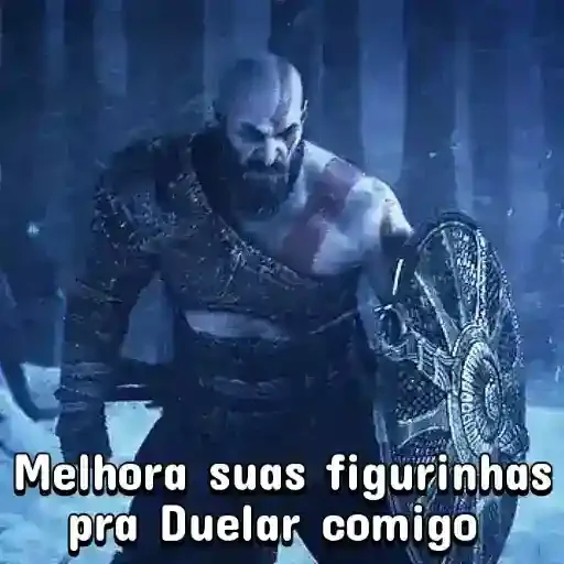 Personagem de God of War com expressão séria e braço levantado, fundo escuro com luz azul. Texto: 'AQUI NÃO É LUGAR PRA…