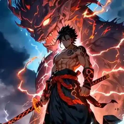 Personagem de anime com cabelo preto e vermelho, expressão séria, com raios azuis saindo de suas mãos.