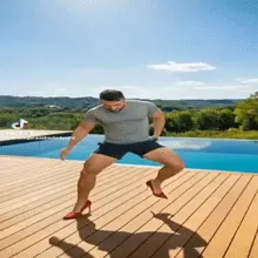 Man dancing next to a pool, wearing shorts and a gray t-shirt, with a pair of red high heels.