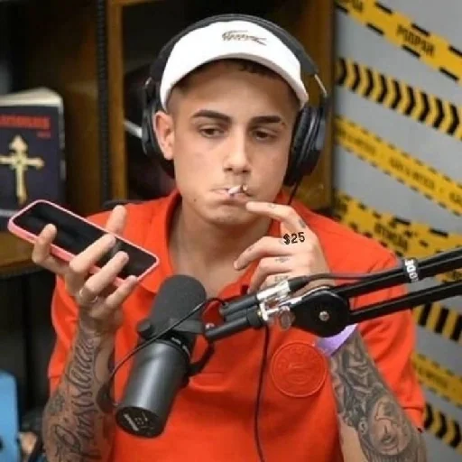 Man with headphones and white cap, in front of a microphone, holding a cell phone and making a gesture with his hand.